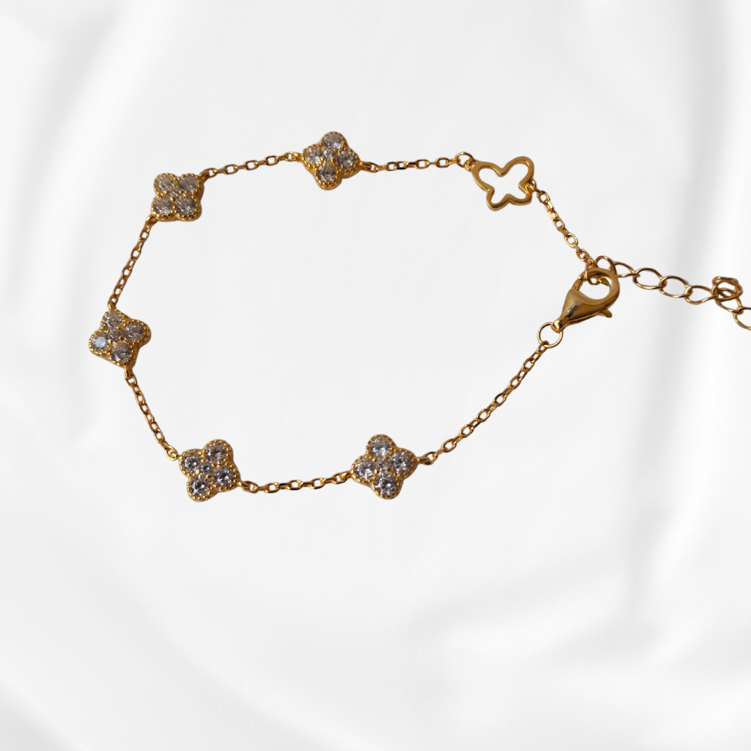 צמיד ייחודי עשוי כסף 925 בציפוי זהב, בעיצוב אלגנטי של תליוני תלתן משובצים באבני זירקוניה...