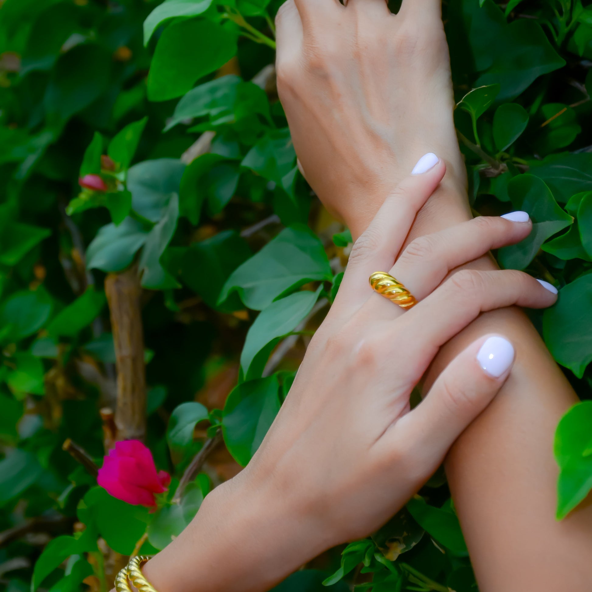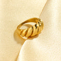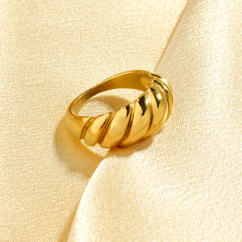 טבעת בצורת טוויסט קלאסי בעיצוב תלת־ממדי מרהיב, עשויה סטיינלס סטיל בציפוי זהב 18 קראט. אלגנטית, אופנתית ומתאימה לכל מראה – מושלמת לשילוב עם טבעות נוספות או כפריט בולט בפני עצמו
