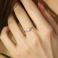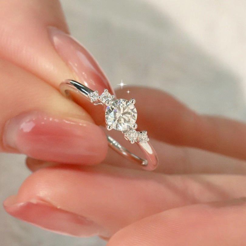 טבעת כסף סטרלינג 925 עדינה ומינימליסטית, משובצת אבן מויסאנייט מרכזית בולטת ומעוטרת בשורה עדינה של אבנים קטנות יותר, היוצרות מראה אסימטרי ומודרני. עיצוב הטבעת נקי ועדין, מושלם למי שמעדיפה מראה פשוט אך אלגנטי