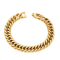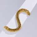 צמיד שרשרת קלאסי ועוצמתי, בעובי 8 מ"מ ובאורך של 18 ס"מ – מושלם למראה בולט ונוכח. עשוי מסטיינלס סטיל בציפוי זהב 18 קראט, מתאים לשימוש יומיומי ומרשים גם באירועים