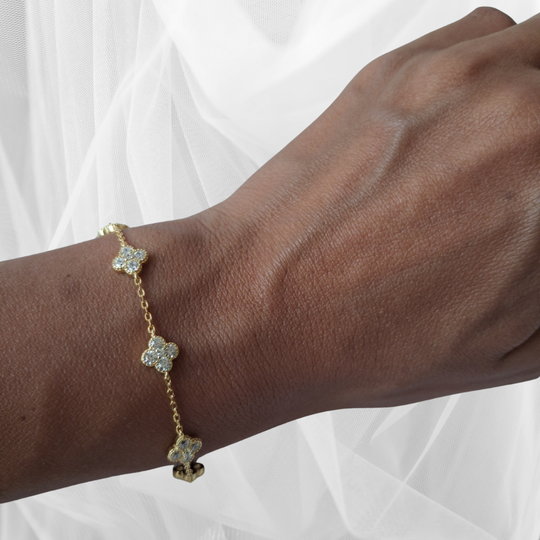 צמיד ייחודי עשוי כסף 925 בציפוי זהב, בעיצוב אלגנטי של תליוני תלתן משובצים באבני זירקוניה מנצנצות. כל תלתן מגלם בתוכו קסם נשי, עם נוכחות מרשימה אך עדינה. תוספת מושלמת לכל לוק – יומיומי או ערב, ומשתלב נהדר עם צמידים נוספים ליצירת שכבות