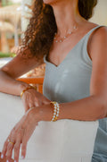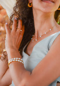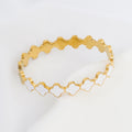 הפרחים המעוגלים בגוון לבן מבריק יוצרים דפוס רך ועדכני, וציפוי הזהב מעניק לצמיד מראה יוקרתי שמתאים ליום ולערב