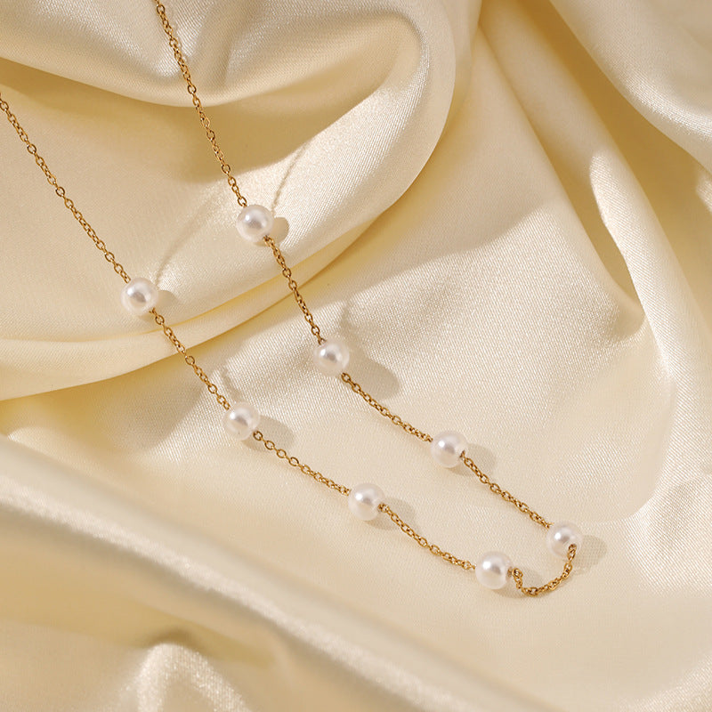 שרשרת אלגנטית משולבת פנינים עגולות לאורך שרשרת מוזהבת דקה. עיצוב שמתאים גם ליום וגם לערב – תוספת מושלמת לכל מראה נשי ורך