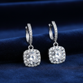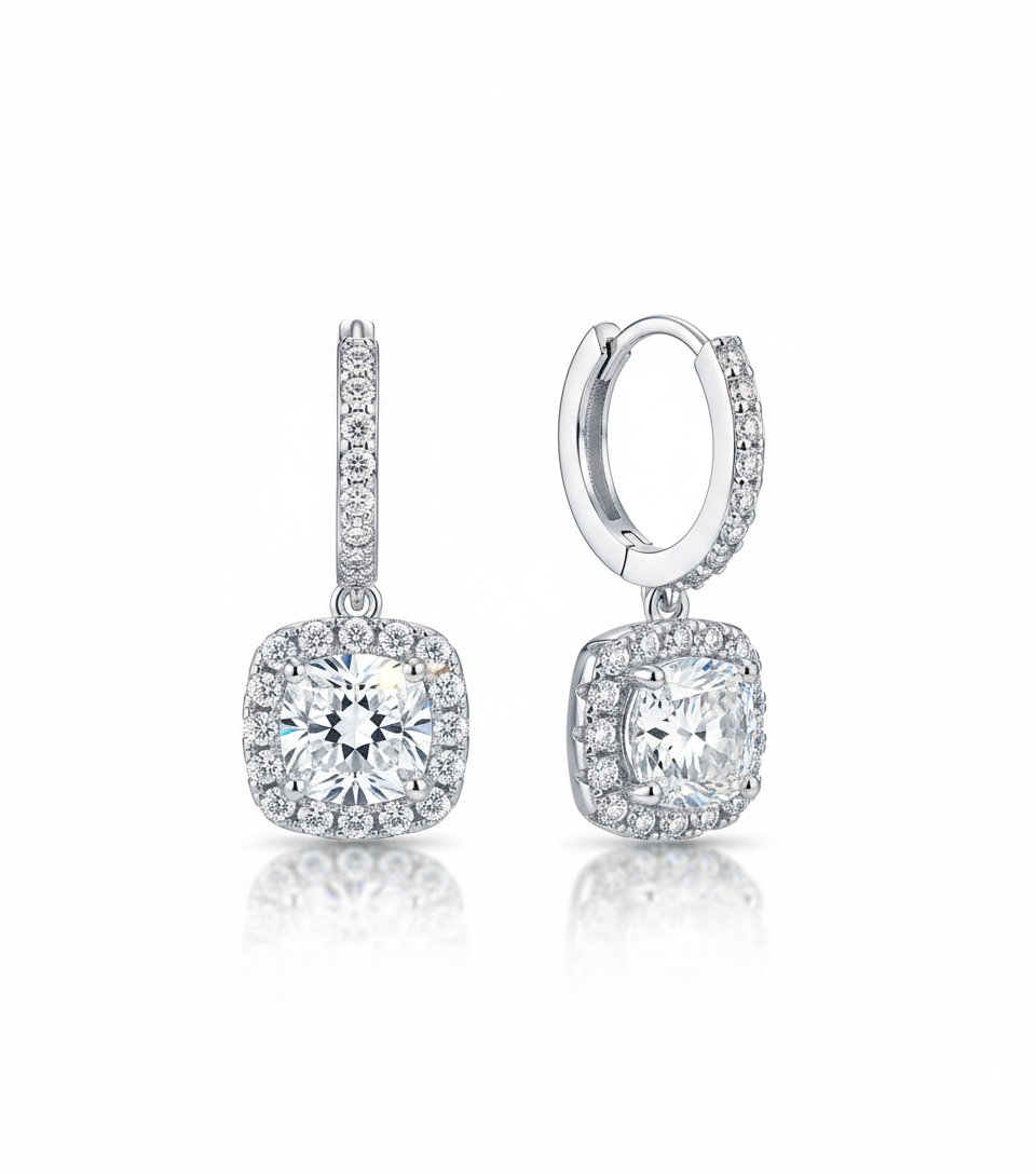 העגילים משלבים אבן מויסאנייט מרכזית, מוקפת הילה עדינה של אבנים מנצנצות, בעיצוב נקי ואלגנטי שמאיר את הפנים בלי להעמיס