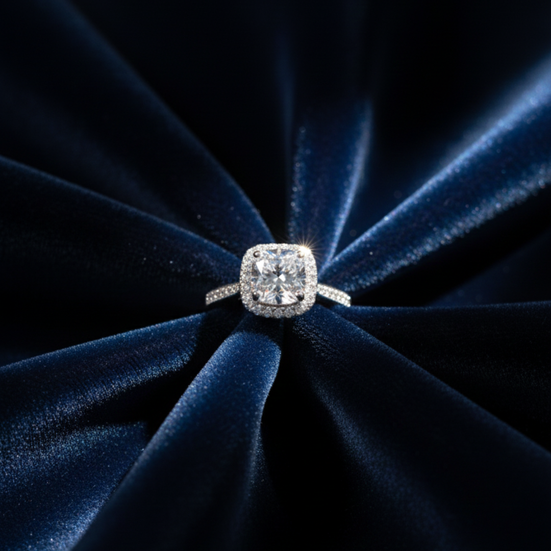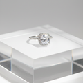 אבן מויסאנייט מרכזית, מוקפת הילה עדינה, יושבת על טבעת כסף סטרלינג